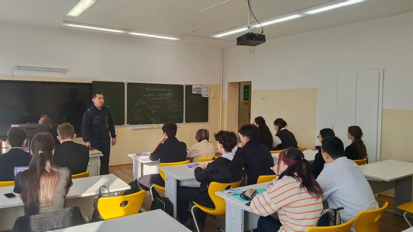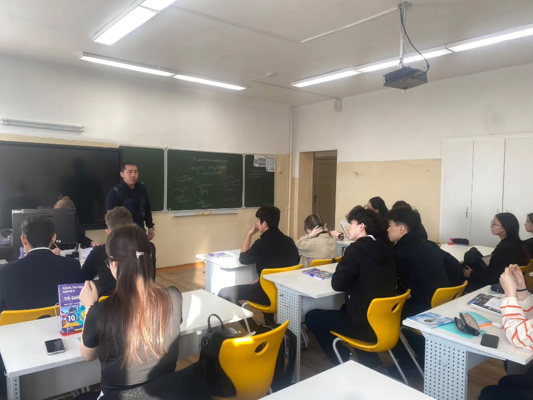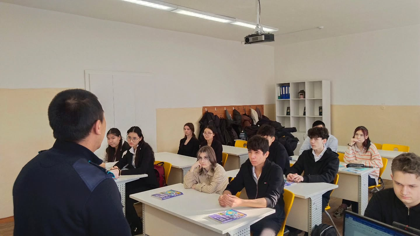 3 декабря 2025 года УИП ГЮП ОМПС Затонского ОП лейтенант полиции Талаптан Е.Қ. и лейтенант полиции Кадылбеков К.Н.в рамках ОПМ «16 дней без насилия» провели профилактическую беседу с учениками 10-11 классов на тему: «Буллинг , антибуллинг»