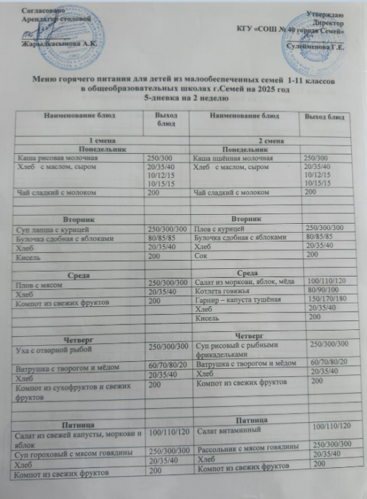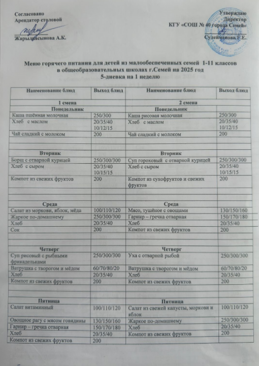 Меню горячего питания для детей из малообеспеченных семей 1-11 классов на 2025 год