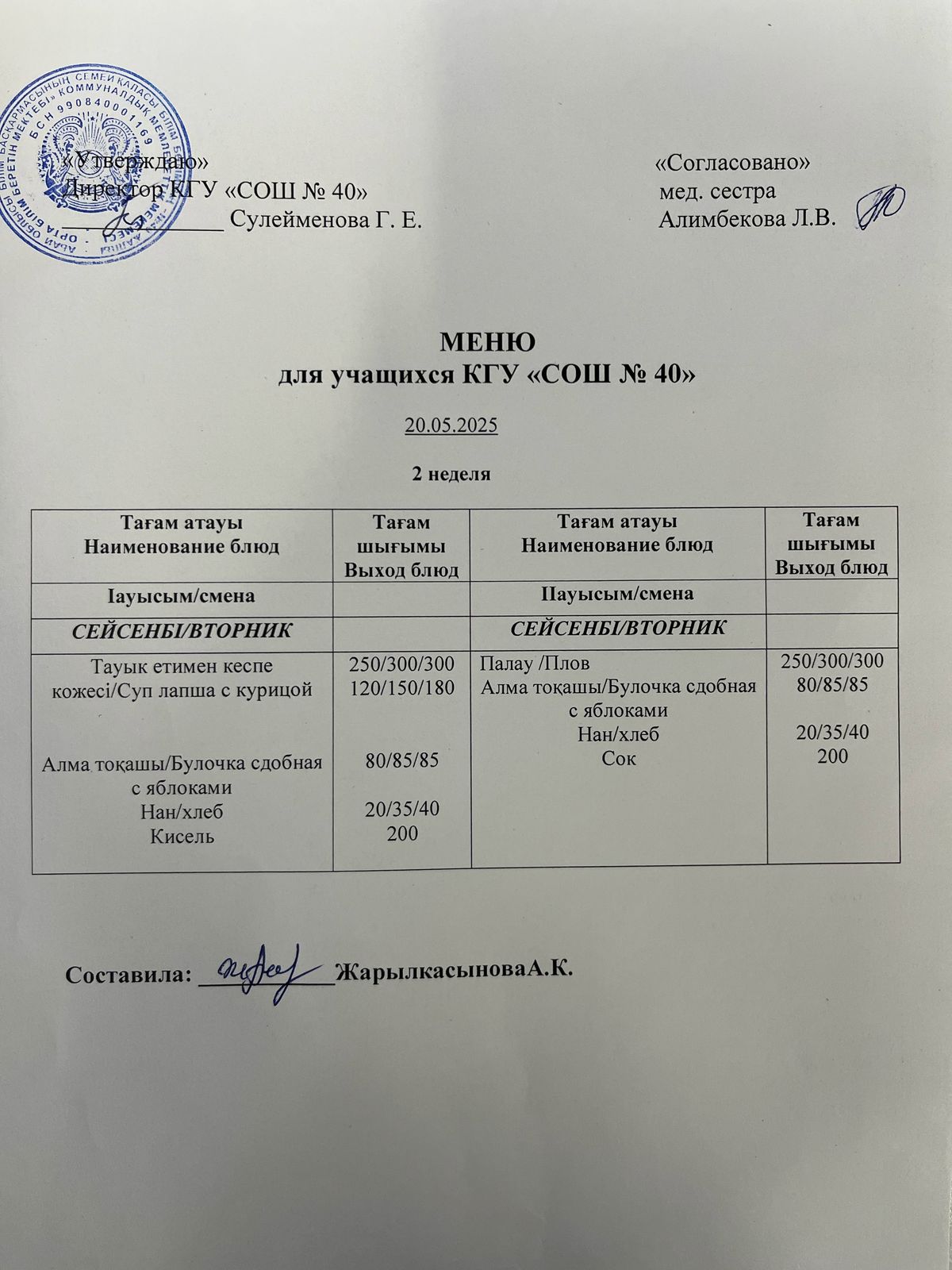 Меню на 20.05.2025