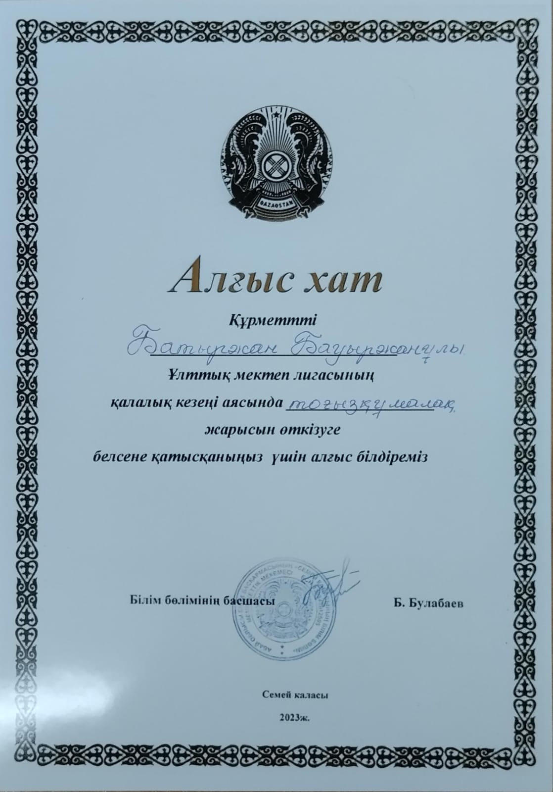 В период с 27 ноября по 1 декабря 2023 года во Дворце творчества детей и молодежи г.Семей проходят соревнования по тогыз кумалак «Национальная школьная лига» среди учащихся школ города, где ученики нашей школы Чиглинцева Аделина и Светбаев Адиль заняли 3 место среди 5-6 классов и 3 общекомандное место среди школ города Семей.